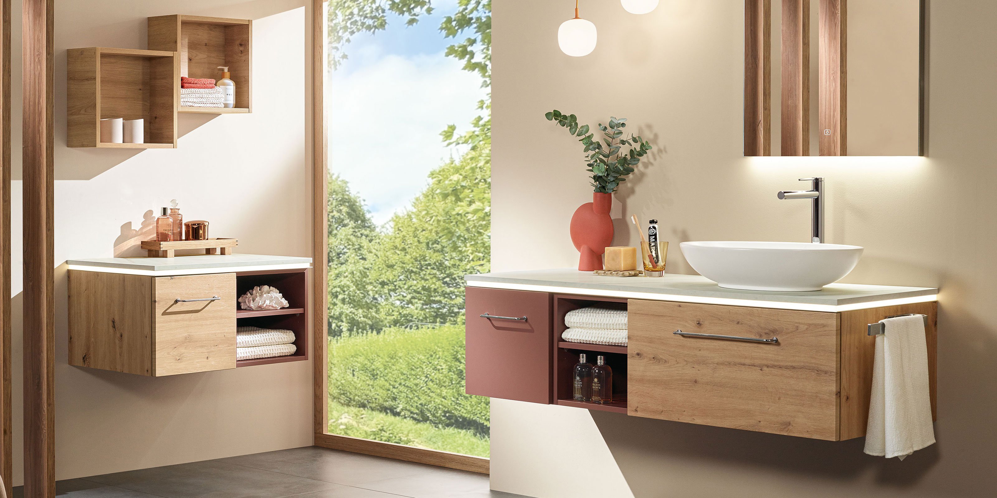 Sämtliche Griffe, Beschläge, Accessoires und Leuchten sind von bester Qualität. So sind Spiegelschränke und Lichtspiegel ausschließlich mit energieeffizienten LEDs ausgestattet und alle Elektroteile sind natürlich VDE-geprüft.