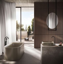 Die exakt planebenen Unterseiten der Schalen ermöglichen eine nahezu nahtlose Anbindung an den jeweiligen Untergrund – ganz gleich, ob es sich dabei um Holz, Naturstein, Beton oder eine andere glatte Oberfläche handelt. Serienmäßig sind die Schalenwaschtische zudem schalldämmend ausgestattet, ein wichtiges Kriterium in allen Umgebungen, in denen Geräuschquellen reduziert werden sollen, beispielsweise in Hotelbädern oder in privaten Badräumen mit angrenzendem Schlafbereich.